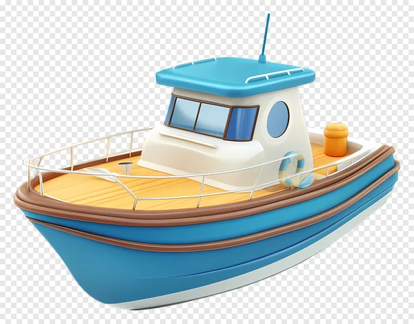 Set sail with this charming 3D cartoon motorboat PNG, perfect for your next creative project! Featuring a vibrant blue hull, classic white cabin, and a detailed wooden deck, this stylized yacht includes a lifebuoy and antenna, all rendered in a clean, modern 3D style. The transparent background makes it easy to integrate into any design, from websites and presentations to educational materials and digital art. Ideal for themes related to summer, holidays, travel, nautical adventures, or children's content. Download this high-quality, free PNG image now to add a splash of fun to your designs!