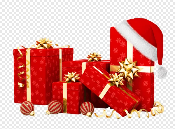 Download this vibrant 3D rendered PNG of festive Christmas gifts for free! Featuring multiple beautifully wrapped red present boxes adorned with elegant gold ribbons, sparkling bows, and delicate snowflake patterns. A classic Santa hat sits atop one large gift, accompanied by striped red and gold Christmas baubles and curling gold ribbons, all on a transparent background. Perfect for holiday greetings, party invitations, social media posts, website banners, or any digital project needing a cheerful, high-quality holiday visual. Enhance your seasonal designs with this eye-catching and versatile holiday graphic, ideal for Christmas and New Year celebrations.