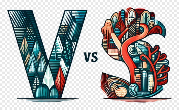 Download this captivating free PNG featuring a unique 'W vs S' abstract design. The image showcases two distinct artistic interpretations of the letters 'W' and 'S' against a striking black background. 'W' is rendered with intricate geometric patterns, architectural elements, and cool teal and blue tones, while 'S' takes on an organic, tree-like form with fluid red, orange, and natural hues. This vibrant, high-quality transparent PNG is perfect for graphic designers, content creators, and anyone needing a striking visual for presentations, blog posts, social media, or website banners. Explore the artistic contrast and add a modern touch to your projects. Get your free download now!