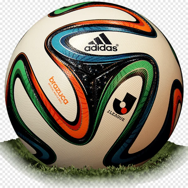 Download this vibrant, high-quality Adidas Brazuca Official Match Ball PNG image for free. Featuring its iconic colorful wavy patterns in orange, blue, green, and black, alongside the Adidas logo and J.League emblem, this soccer ball rests on realistic green grass. Perfect for adding a dynamic sporting touch to your graphic designs, presentations, websites, or digital art. Enhance your projects with this transparent background football asset today!
