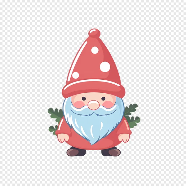 Download this charming and cute Christmas gnome PNG for free! This festive cartoon illustration features a cheerful dwarf character with a bright red polka-dotted pointed hat, a fluffy light blue beard, and a tiny pink nose, adorned with subtle green pine sprigs behind. Perfect for adding a touch of holiday magic to your seasonal projects, greeting cards, digital designs, social media posts, or winter-themed crafts. Get this high-quality, transparent background gnome graphic to instantly enhance your creative work without attribution!