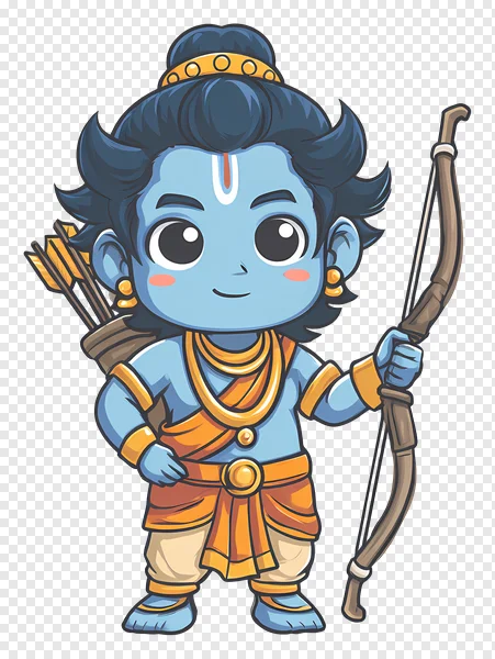 Download this adorable chibi Lord Rama PNG image for free! This charming cartoon depicts the revered Hindu deity with his iconic blue skin, traditional dhoti, golden ornaments, and a mighty bow and arrow. Perfect for festive greetings like Ram Navami and Diwali, kids' educational materials, spiritual projects, or any design needing a cute representation of Ram Lalla. The transparent background makes it easy to integrate into your creative work. Get your high-quality, free Lord Rama clip art today!