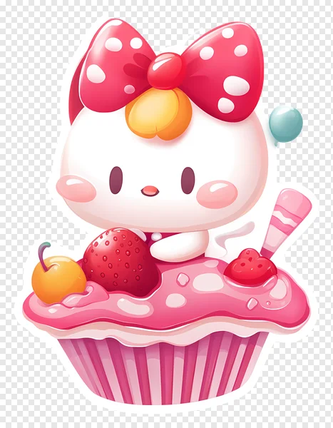 Download this delightful PNG of a kawaii character, featuring a charming white bunny-like figure wearing a large pink polka-dotted bow, sitting playfully on a vibrant pink frosted cupcake. The cupcake is adorned with a juicy red strawberry, a bright yellow cherry, and a small heart-shaped berry, adding to its sweetness. This adorable, high-quality, transparent background image is perfect for various creative projects, including digital art, scrapbooking, invitations, social media graphics, and more. Get your free download now and add a touch of cuteness to your designs!