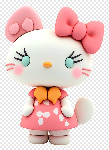 Download this charming 3D rendered character, reminiscent of the beloved Hello Kitty, perfect for adding a touch of kawaii to your projects. This delightful image features a sweet white cat with prominent pink ears, an iconic large pink bow, and soft blue eyes with playful eyelashes. The kitty is dressed in a vibrant pink polka-dot dress, complete with an orange collar and a subtle white tail. Its squishy, clay-like texture gives it a modern, appealing aesthetic. Ideal for digital designs, scrapbooking, invitations, social media graphics, or children's crafts. Get this high-quality, transparent PNG for free and infuse your creations with adorable charm!