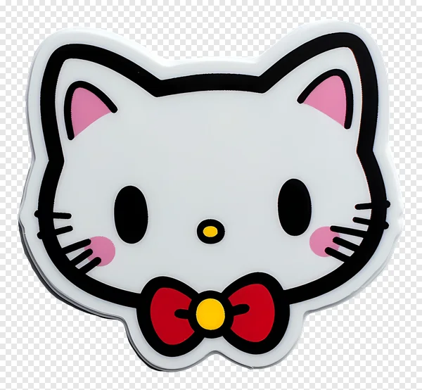 Discover this charming white cartoon cat head PNG, an iconic kawaii character featuring delightful pink inner ears, expressive black eyes, a cute yellow nose, subtle pink blush marks on its cheeks, and a vibrant red bow with a yellow center. Set against a transparent background, this high-quality illustration is perfect for adding a touch of sweetness and charm to your designs, digital art, scrapbooking, social media graphics, educational materials, or personal projects. Easily download this adorable feline graphic for free and enhance your creative endeavors with its classic, friendly appeal. Ideal for fans of cute animal characters and simple, heartwarming visuals.