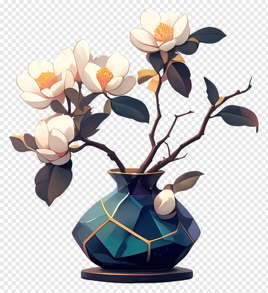 Tags: aesthetic flowers anime style blue glass vase cherry blossoms decorative tag delicate flowers digital art floral illustration flower arrangement flower petals free PNG glowing vase magnolia nature design pink flowers plant branches sakura spring blooms transparent image wooden stand