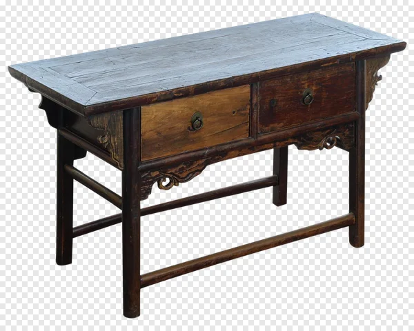 Download a high-quality, transparent PNG image of a beautifully aged antique Chinese console table. Perfect for interior design projects, historical illustrations, or adding a touch of vintage charm to your digital artwork. This free-to-use image features intricate detailing and a rich, dark wood finish. Enhance your designs with this authentic piece of furniture – download now and use it freely!