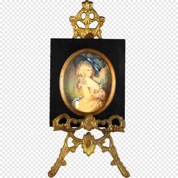 Discover this exquisite free PNG of an antique Rococo miniature portrait, elegantly displayed on a beautifully ornate gold easel. This vintage artwork features a charming lady with voluminous curly hair and a wide-brimmed hat, painted in delicate pastel hues. Perfect for adding a touch of classic elegance to your digital projects, historical themes, graphic designs, or presentations. Download this high-quality, transparent background image today to enhance your creative works with a timeless piece of art history. Ideal for design enthusiasts, educators, and anyone seeking unique aesthetic elements. Get your free download now!