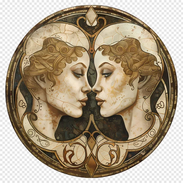 Immerse your projects in timeless elegance with this free Art Nouveau Gemini Twins PNG. Featuring two beautifully mirrored female faces in a stunning gold and cream palette, this ornate circular design evokes the intricate beauty of vintage stained glass or a classic mosaic. The delicate features, flowing golden hair, and distressed texture add a mystical, ethereal touch, perfect for invoking themes of duality, connection, and classic artistry. Ideal for graphic design, digital art, scrapbooking, logos, social media, or any project needing a touch of vintage mystique and symbolic depth. Download this high-quality, transparent PNG today and infuse your creations with unique Art Deco-inspired charm!
