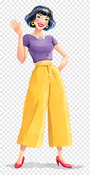 Tags: Asian woman PNG bob haircut character cheerful digital art fashion free download friendly illustration modern outfit purple top red heels smiling stylish transparent background waving wide leg pants woman yellow pants