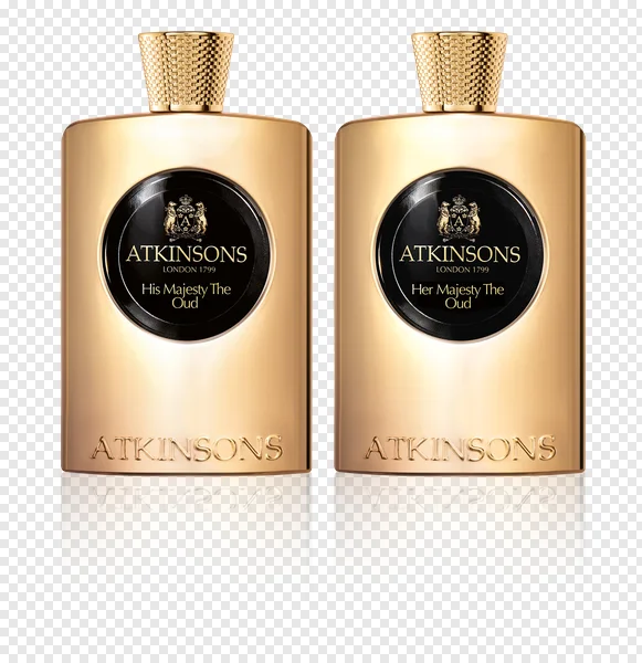Tags: Atkinsons Her Majesty The Oud His Majesty The Oud London 1799 Oud perfume aroma beauty cosmetic product gold bottle high-end perfume luxury fragrance men's fragrance metallic finish opulent perfume bottle PNG product photography scent textured cap transparent background women's fragrance
