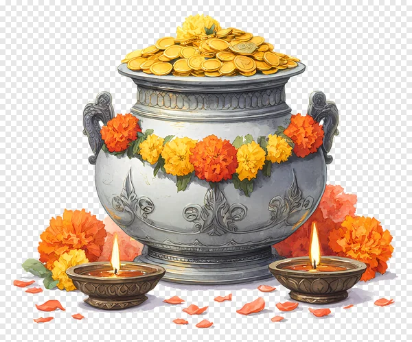 Download this stunning free PNG image featuring an auspicious silver kalash (pot) overflowing with radiant gold coins, symbolizing wealth and prosperity. Adorned with a vibrant garland of orange and yellow marigold flowers and flanked by two beautifully lit traditional oil lamps (diyas), this transparent background clipart is perfect for celebrating Diwali, Lakshmi Puja, or any design project needing a touch of abundance and good fortune. Use this high-quality, transparent asset for festive greetings, digital invitations, website banners, educational materials, or personal creative works. Get this perfect symbol of richness for your projects today!