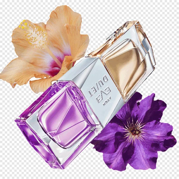 Elevate your designs with this stunning free PNG of Avon Eve Duet perfume. Featuring a beautiful angular bottle with shimmering silver and gold accents, and vibrant purple liquid, it's elegantly framed by delicate orange and deep purple flowers. Perfect for beauty blogs, e-commerce graphics, digital art, or marketing materials. Capture the essence of luxury and floral fragrance. Download now for high-resolution clarity and a transparent background, ideal for seamless integration into any project. Enhance your visual content with this premium cosmetic image.