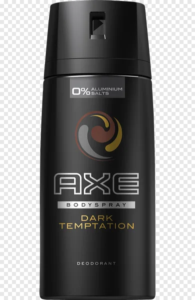 Download a high-quality, transparent PNG image of Axe Dark Temptation body spray deodorant. Perfect for graphic design, presentations, or website use. This free PNG features the iconic Axe branding, 'Dark Temptation' text, and highlights its 0% aluminum salts formula. Enhance your projects with this professional-looking deodorant product image – download now for free!