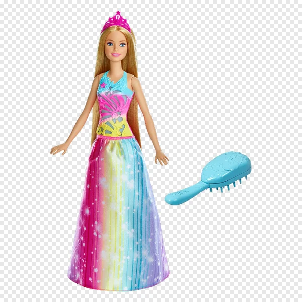 Unleash the magic with this vibrant Barbie doll PNG image, perfect for all your creative projects! Featuring a beautiful blonde Barbie princess wearing a dazzling rainbow-colored dress with sparkling details and a chic pink tiara, this high-quality transparent background clipart also includes her signature blue hairbrush. Ideal for birthday invitations, digital scrapbooking, educational materials, or adding a touch of fantasy to your designs. Download this free, enchanting Barbie image today and bring a splash of color and joy to your next creation. Get your royalty-free Barbie graphic now!