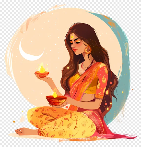 Download this stunning free PNG image featuring a beautiful Indian woman in traditional attire, gracefully holding two lit diyas. Set against a serene background with a crescent moon, this exquisite illustration evokes spiritual tranquility and festive warmth. Ideal for Diwali greetings, cultural events, prayer-themed designs, or adding an elegant touch to your digital projects. Get this high-quality, transparent background image instantly for your creative needs!