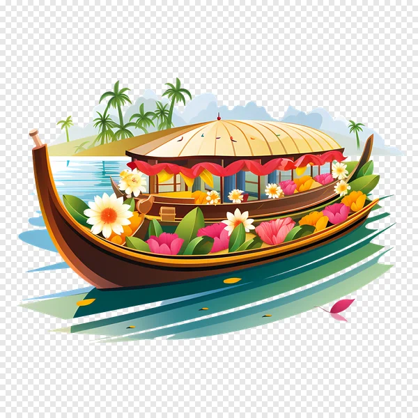 Download this stunning free PNG of a vibrant, floral traditional boat, perfect for adding a touch of exotic beauty to your projects! This captivating illustration features a beautifully decorated houseboat adorned with colorful tropical flowers in shades of pink, white, and yellow, lush green leaves, and elegant red drapes. Set against a serene blue water background with distant palm trees and clouds, it evokes a sense of tropical paradise and festive celebrations. Ideal for travel blogs, event invitations, cultural designs, or any creative graphic work requiring a touch of Southeast Asian charm. Get your high-quality transparent background image now!