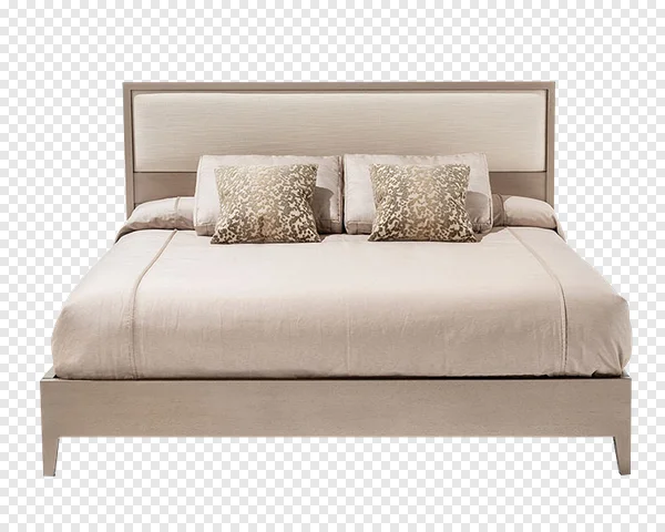 Download this high-resolution PNG image of a stylish beige modern bed. Perfect for interior design websites, brochures, or presentations. The image features a contemporary bed frame with a neutral upholstered headboard and subtly patterned throw pillows. Enhance your design projects with this clean and elegant image. Download now for free and easily incorporate it into your work!