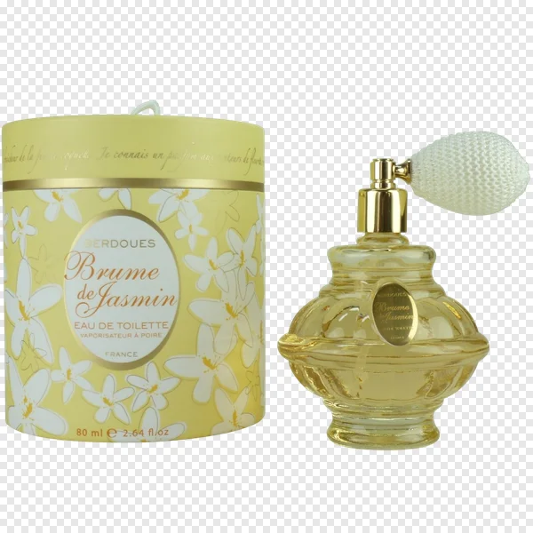 Download this exquisite Berdoues Brume de Jasmin Eau de Toilette PNG image for free. Featuring a beautifully designed vintage perfume bottle with a classic white atomizer bulb and its elegant yellow cylindrical packaging adorned with delicate white jasmine flowers. This 80ml French fragrance, 'Jasmine Mist,' offers a touch of classic sophistication. Ideal for beauty blogs, product mockups, graphic design projects, or adding a luxurious floral accent to your digital content. Get this high-quality, transparent background image now!