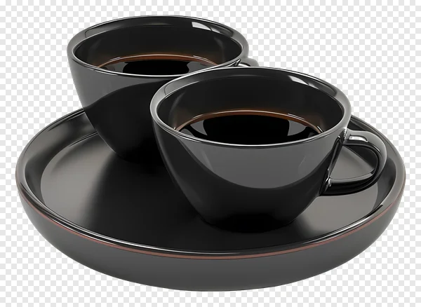 Download this stunning, high-resolution PNG image of two black coffee cups and a saucer, perfect for graphic design projects, presentations, or website backgrounds. This elegant espresso set features a glossy finish and realistic rendering. Enhance your visuals with this free-to-use coffee graphic! Ideal for coffee shops, food blogs, or any design needing a touch of sophistication. Get your free download now!