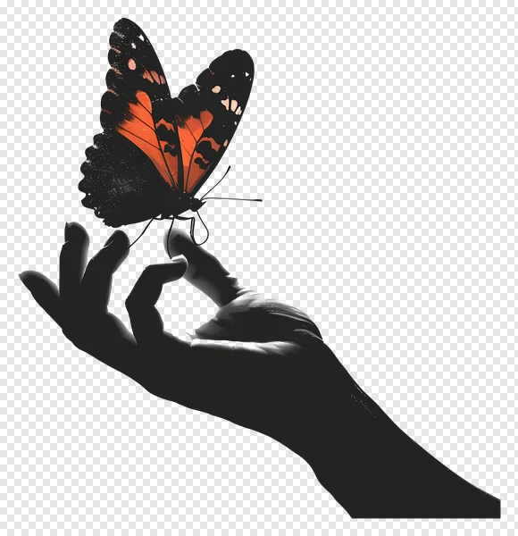 Download this stunning, high-quality butterfly on hand PNG image for free! Perfect for designers, artists, and creatives. This beautiful illustration features a vibrant orange butterfly delicately perched on a human hand against a dark, dramatic background. Use it for website graphics, social media posts, posters, or any project needing a touch of nature and symbolism. Transparent background for easy integration. Get your free download now!