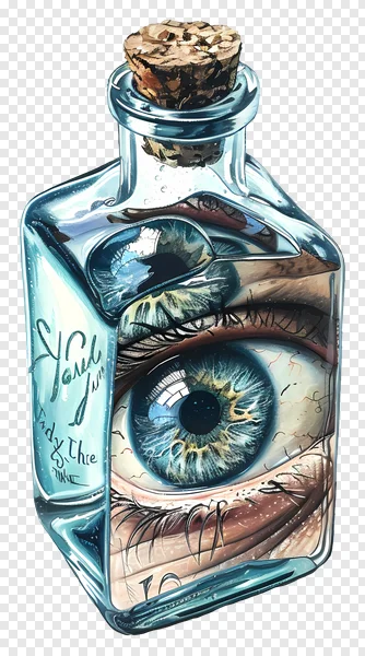 Download this stunning, free PNG image featuring a captivating blue-green human eye meticulously encapsulated within a clear glass bottle, sealed with a textured cork stopper. This unique and surreal digital artwork, subtly highlighted by the elegant script "You" on its side, evokes powerful themes of trapped emotions, mystical vision, or a preserved gaze. Perfect for fantasy projects, psychological concepts, website backgrounds, social media posts, or any creative design needing an intriguing, high-quality transparent illustration. Get your free, high-resolution download now and add a touch of mystery and depth to your next project!