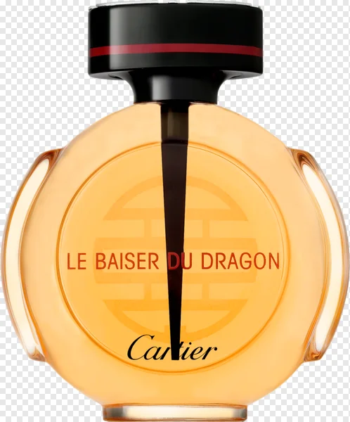 Download a stunning free PNG image of the iconic Cartier Le Baiser Du Dragon perfume bottle. This high-resolution graphic features the elegant amber liquid, sophisticated rounded bottle design with its distinctive black cap and red accent, and the bold "Le Baiser Du Dragon" and "Cartier" branding. Perfect for adding a touch of luxury to your beauty blogs, fashion e-commerce sites, graphic design projects, marketing materials, or presentations. Get this premium quality fragrance bottle PNG with a transparent background instantly for all your creative needs. Enhance your visuals with this exquisite designer perfume.
