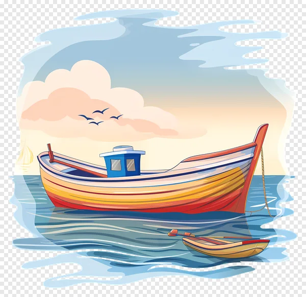 Download this charming cartoon fishing boat PNG image for free! Perfect for nautical themed designs, children's illustrations, website graphics, and more. This high-quality, transparent background image features a colorful boat with oars, set against a beautiful sunset and sea. Enhance your projects with this delightful and versatile graphic – download now and let your creativity sail!