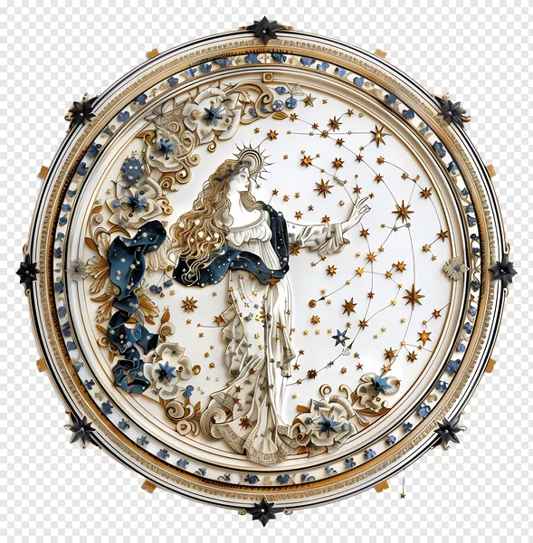 Discover our stunning free PNG of a celestial goddess, elegantly depicted with flowing golden hair and a radiant sun-ray crown. This intricate artwork features a mythical woman gracefully interacting with golden stars and constellations against a pristine white background, suggestive of creating the cosmos. Encased in a richly ornate circular frame adorned with delicate blue floral elements and elaborate golden scrollwork, this image exudes a timeless, majestic charm. Perfect for mythological themes, digital art projects, scrapbooking, fantasy designs, or adding a touch of divine elegance to your creative works. Download this high-quality, transparent PNG for free today and bring ancient beauty and celestial wonder to your creations!
