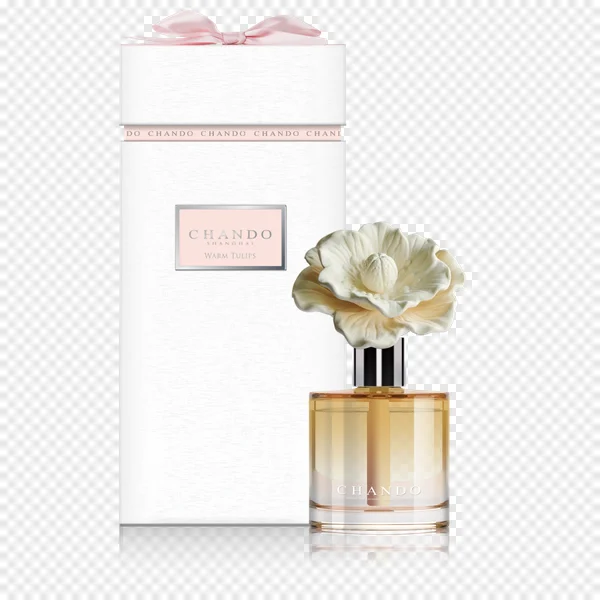 Download this high-quality, free PNG image of the Chando Shanghai 'Warm Tulips' fragrance diffuser. This elegant product shot showcases a stylish amber-liquid filled glass bottle topped with a beautifully crafted white ceramic flower, alongside its sophisticated white gift box tied with a delicate pink ribbon. Ideal for e-commerce stores, marketing campaigns, blog posts, or digital art projects, this transparent background PNG allows for seamless integration into any design. Enhance your content with this luxurious home fragrance piece, perfect for conveying serenity and upscale aromatherapy.