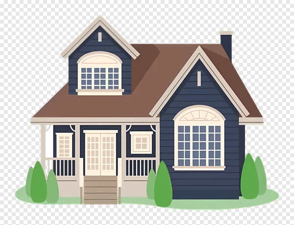 Download this high-quality free PNG of a charming blue suburban house, featuring a cozy front porch with white columns, a distinct gable roof, and a quaint dormer window. This flat design illustration showcases a modern residential home with dark blue siding, a warm brown roof, and crisp white trim, accented by lush green shrubs. Perfect for real estate projects, architectural concepts, graphic design, web assets, or educational materials. Enhance your designs with this versatile, transparent vector-style graphic. Get your free home illustration download today!
