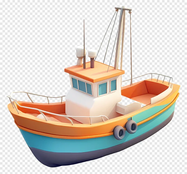 Download this delightful cartoon fishing boat PNG for free! This vibrant 3D rendering features an adorable orange, blue, and white trawler with a transparent background, perfect for a wide range of creative projects. Ideal for graphic designers, educators, or anyone needing a cute marine vessel illustration. Use it for presentations, children's books, website graphics, game assets, or any nautical-themed design. Get this high-quality, charming boat image instantly for personal and commercial use! Enhance your designs with this cheerful and detailed fishing boat graphic.