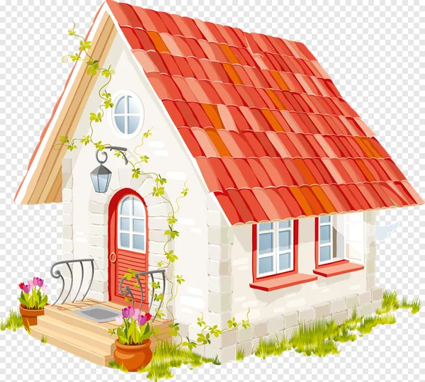 Discover this delightful free PNG image of a charming cartoon house, perfect for adding a touch of whimsy to your projects. This high-quality illustration features a cozy white cottage with a vibrant red tiled roof, a quaint arched red door, and picturesque white-framed windows. Adorned with climbing green ivy, an elegant outdoor lantern, and cheerful potted pink tulips on wooden steps, this idyllic home graphic brings warmth and character. Download this beautiful transparent PNG for free to enhance your designs, websites, presentations, or print materials. Ideal for children's books, greeting cards, architectural concepts, or fantasy themes. Get your cute house illustration now!