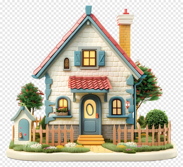 Download this enchanting cartoon house PNG for free! This whimsical 3D illustration features a charming cottage with a red tiled roof, blue trim, glowing windows, a cozy front porch, and a classic picket fence enclosing a vibrant green garden with colorful flowers. Complete with a cute dog house and lush trees, it's perfect for adding a touch of fairy tale magic to your design projects, presentations, children's book illustrations, or educational materials. Enjoy this high-quality, transparent background image for easy integration into any creative endeavor. Ideal for themes of home, fantasy, or village scenes.