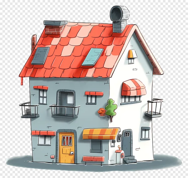 Download this delightful and charming cartoon house PNG for free! This whimsical illustration features a multi-story building with a vibrant red tiled roof, multiple skylights, a classic chimney, and several windows, including picturesque balconies. The design highlights a cheerful yellow main door, a striped orange awning, a quaint green potted plant, and a small bench, adding to its cozy appeal. Perfect for children's books, game assets, architectural concepts, educational materials, website design, or any project needing a friendly, inviting home graphic. Get this high-quality, transparent PNG now and bring a touch of playful charm to your creations!