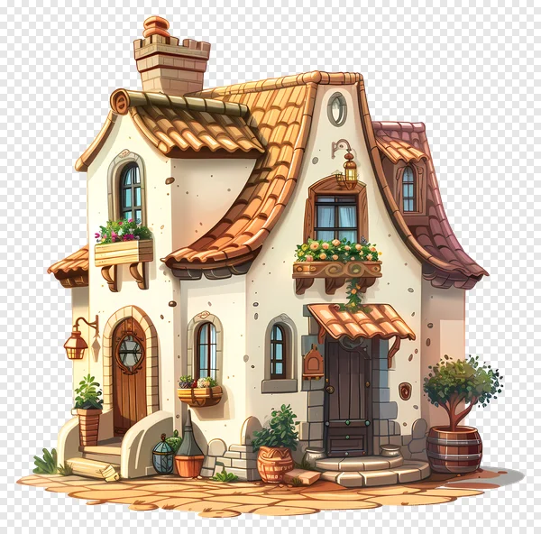 Discover this enchanting cartoon house PNG, perfect for adding a touch of whimsy to your projects! This delightful illustration features a cozy, storybook-style home with a beautiful terracotta tiled roof, charming arched windows, and vibrant flower boxes. Adorned with lanterns and potted plants, it evokes a picturesque European village feel. Ideal for game design, children's books, scrapbooking, digital art, or any creative design. Download this high-quality, free transparent clipart today and bring your creative visions to life with ease!