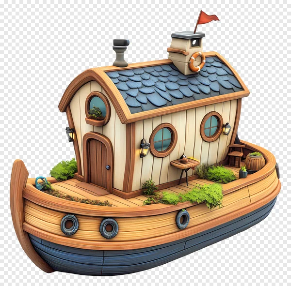Dive into a world of whimsical charm with this adorable cartoon houseboat PNG, available for free download! This stylized floating home features intricate details like light wooden siding, a contrasting blue shingle roof, cozy round windows resembling portholes, and a quaint wooden door. The spacious deck is beautifully adorned with lush green moss, a rustic outdoor table and stool, and even classic tire fenders for an authentic nautical feel. Complete with a chimney, lanterns, and a red flag, this high-quality, transparent PNG image is perfect for game design, storybook illustrations, website elements, or any creative project needing a touch of fantasy and marine adventure. Get this unique, stylized house on the water instantly and bring your designs to life!
