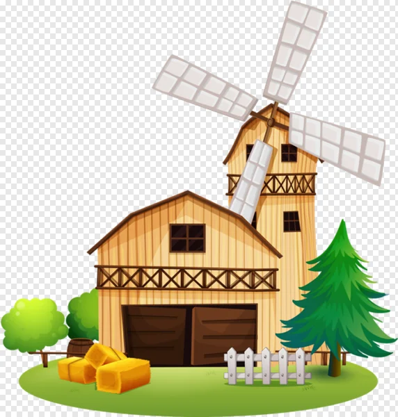Discover our charming farm barn and windmill illustration, a high-quality, transparent PNG available for free download! This delightful cartoon image features a classic wooden barn with large doors, a towering windmill with spinning blades, vibrant golden hay bales, lush green bushes, a tall evergreen tree, and a quaint white picket fence, all set on a patch of grassy land. Ideal for educational resources, children's stories, game design, website graphics, presentations, or any creative project needing a rustic, country touch. Enhance your designs with this whimsical rural landscape. Get your free farm-themed graphic today and add a touch of bucolic charm without attribution!