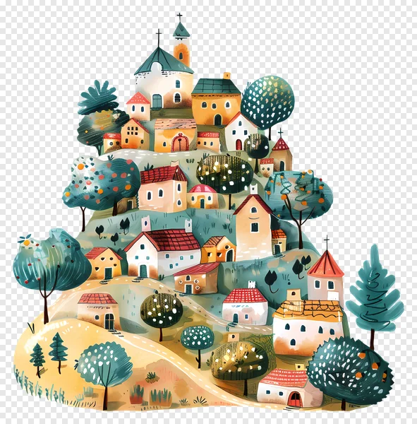 Discover this enchanting free PNG of a whimsical hillside village, perfect for adding a touch of storybook magic to your projects. This vibrant watercolor illustration features a picturesque townscape with charming colorful houses, some with classic red roofs, a prominent church steeple, and lush trees adorned with dotted foliage and fruit, all nestled gracefully on rolling hills. The unique, painterly style and transparent background make this high-quality digital art ideal for graphic design, web assets, educational materials, scrapbooking, or presentations. Download this delightful and free image today to infuse your creative work with the serene beauty of a quaint, artistic village scene.