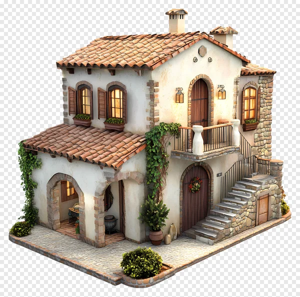 Download this beautiful, high-quality free PNG of a charming Mediterranean-style villa. Featuring classic terracotta roof tiles, rustic stucco walls, elegant stone accents, and a picturesque balcony with wrought iron railing. This detailed 3D rendered house includes arched windows with wooden shutters, glowing lanterns, climbing vines, stone steps, and subtle festive decor like a Christmas wreath and a potted mini Christmas tree. Perfect for architectural visualization, graphic design projects, digital art, or adding a touch of cozy elegance to any creative work. Get your transparent background image today!