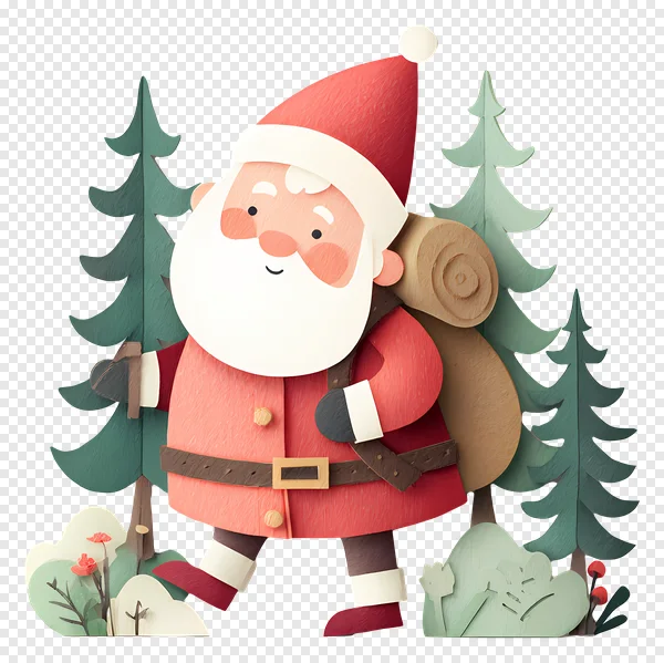 Download this enchanting free PNG of a happy, whimsical Santa Claus embarking on a festive journey through a serene, stylized forest. This high-quality, paper-cut style illustration features Jolly Old Saint Nick with his iconic red suit, white beard, walking stick, and a large gift sack over his shoulder, perfect for adding holiday cheer to your designs. Ideal for Christmas cards, website banners, social media posts, educational materials, or any creative project needing a touch of seasonal magic with a transparent background. Get this charming Santa illustration instantly to spread joy!
