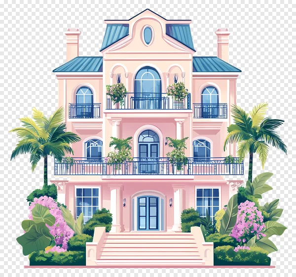 Discover this stunning free PNG of a charming pink mansion, beautifully illustrated with a grand, opulent design. This luxurious tropical villa features elegant balconies with intricate railings, arched windows, a striking blue roof, and a majestic entrance framed by lush green foliage, vibrant pink flowers, and tall palm trees. Perfect for architectural projects, digital art, website backgrounds, or creating an inviting aesthetic for your designs. Download this high-quality, transparent background image today and add a touch of dream-home elegance to your creative works. Get your free vector-style house PNG now!