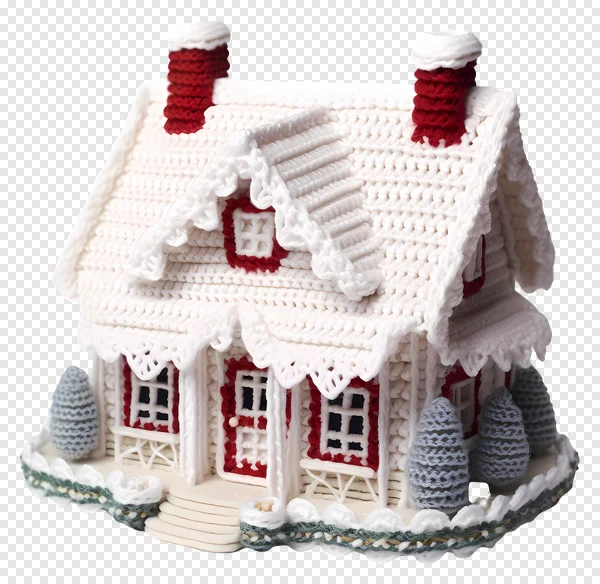 Tags: Christmas house PNG cozy home crochet house evergreen trees festive village free download frosted details handmade look holiday decor holiday decoration miniature house red accents seasonal graphic snow house snow-covered transparent background white house winter house winter wonderland