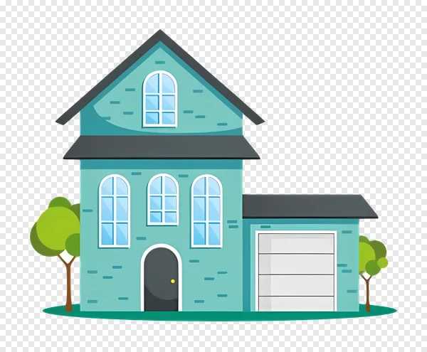 Download this delightful free PNG of a charming teal flat design house, perfect for various creative projects. This two-story suburban home illustration features a distinctive dark grey roof, arched windows with light blue panes, a welcoming front door with a yellow knob, and an attached white garage. Lush green trees flank the property on a patch of grass, adding a touch of nature to the modern design. Ideal for real estate presentations, architectural concepts, children's books, web design, app interfaces, educational materials, or any project needing a friendly, contemporary home graphic. Get this high-quality, transparent house illustration instantly for your personal and commercial use!
