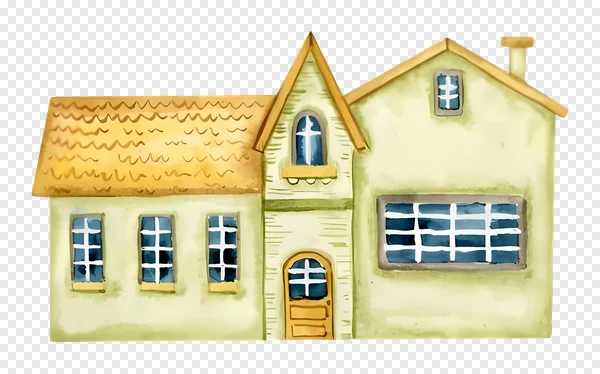 Download this enchanting free Watercolor House PNG clipart, perfect for adding a touch of whimsy to your digital projects! This charming illustration features a cozy home with light green walls, a warm yellow textured roof, multiple grid-paned windows (including an arched one), an arched wooden door, and a quaint chimney, all rendered in a beautiful, soft watercolor style. Ideal for greeting cards, invitations, educational materials, scrapbooking, website design, and more. Get your high-quality, transparent background house image now and bring your creative ideas to life with this delightful architectural graphic.