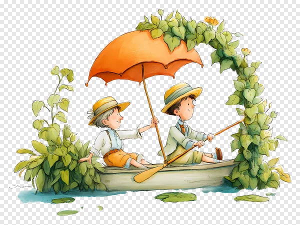 Immerse your projects in whimsical charm with this free transparent PNG illustration. This delightful watercolor-style image captures two adventurous children on a serene boat trip; one boy holds a vibrant orange umbrella while the other patiently fishes. Surrounded by lush green foliage and floating on calm waters, this illustration evokes a sense of innocence, nostalgia, and outdoor fun. Perfect for children's book illustrations, greeting cards, educational resources, scrapbooking, or any creative design needing a touch of heartwarming wonder. Download this high-quality PNG today to add a unique, storybook aesthetic to your digital and print creations!