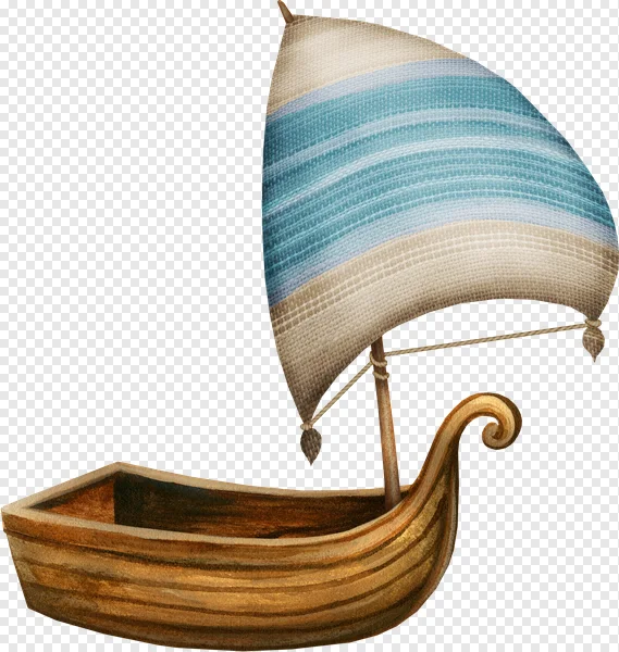 Set sail with this charming watercolor wooden sailboat PNG, available for free download! Featuring a rustic brown boat hull, a vibrant blue and beige striped sail with a textured fabric look, and elegant golden scroll details at the bow. This high-quality, transparent PNG image is perfect for adding a touch of nautical adventure to your children's book illustrations, digital scrapbooking, party invitations, website designs, or any creative project. Instantly enhance your designs with this adorable, hand-drawn style boat clipart. Download now and let your imagination float!