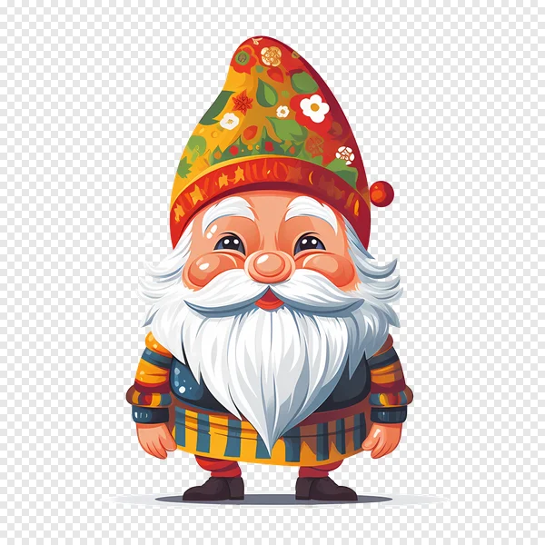 Dive into a world of whimsy with this adorable cartoon gnome PNG! Featuring a happy, smiling dwarf with a long, flowing white beard, rosy cheeks, and bright eyes, this vibrant illustration is sure to charm. The gnome wears a uniquely patterned hat adorned with colorful floral and leaf designs, complemented by a cheerful striped tunic in warm hues. This high-quality, free PNG image comes with a transparent background, making it perfect for Christmas, holiday cards, fantasy themes, scrapbooking, digital art, children's projects, or any creative design that needs a touch of magic. Download now and add this lovable mythical creature to your collection!