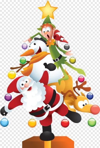 Discover this vibrant and free PNG image featuring a delightful stack of classic Christmas characters! A jolly Santa Claus, a smiling snowman, a surprised elf, and a happy reindeer are creatively arranged, topped with a glowing star and adorned with colorful festive baubles. This high-quality, transparent cartoon illustration is perfect for adding a touch of holiday magic to your greeting cards, digital projects, social media posts, school assignments, or any DIY Christmas craft. Download this fun and cheerful holiday graphic for free and make your festive designs shine!