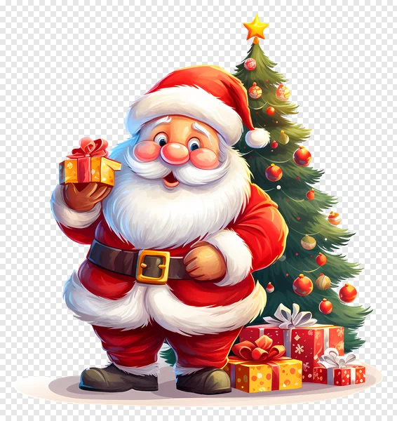 Bring the joy of Christmas to your designs with this vibrant, free PNG of Santa Claus! Our cheerful Santa, adorned in his classic red suit and hat, beams with happiness while holding a beautifully wrapped golden gift. Beside him stands a festive Christmas tree, twinkling with ornaments and surrounded by more brightly colored presents. This high-quality transparent PNG is perfect for holiday cards, social media posts, websites, invitations, or any seasonal graphic design project. Spread cheer and download this delightful Father Christmas illustration for free today!